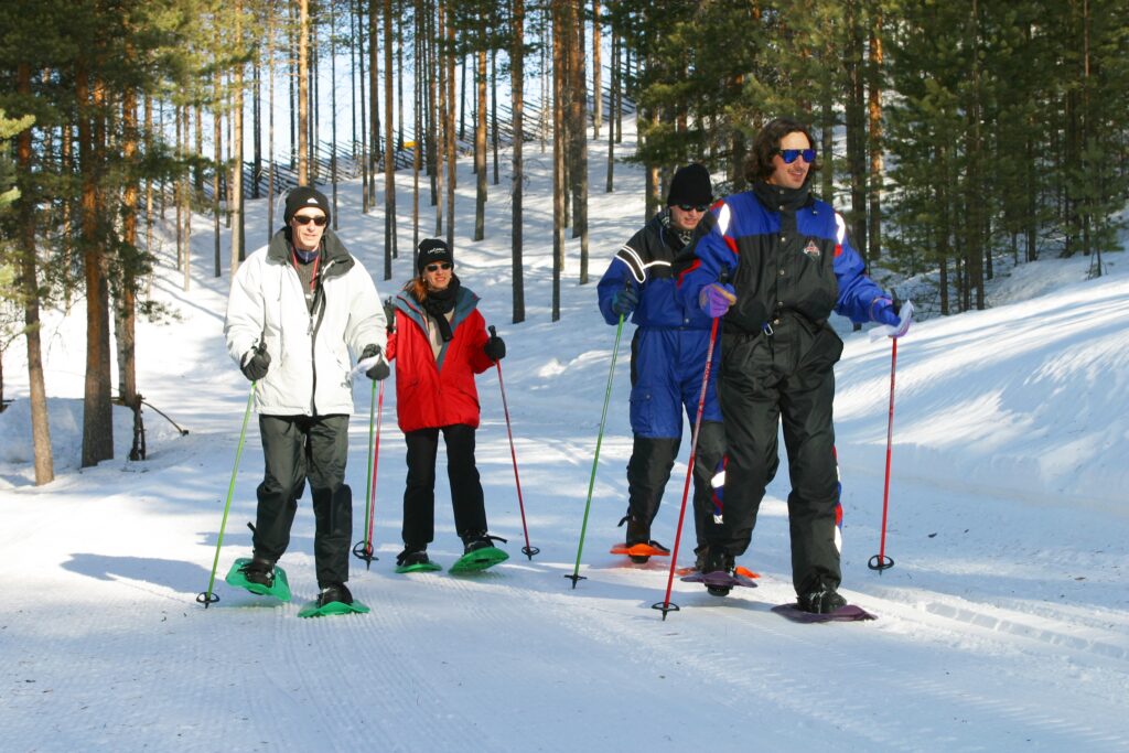 Nach dem Mittagessen 2-stündige Schneeschuhtour durch die Taiga und über einen