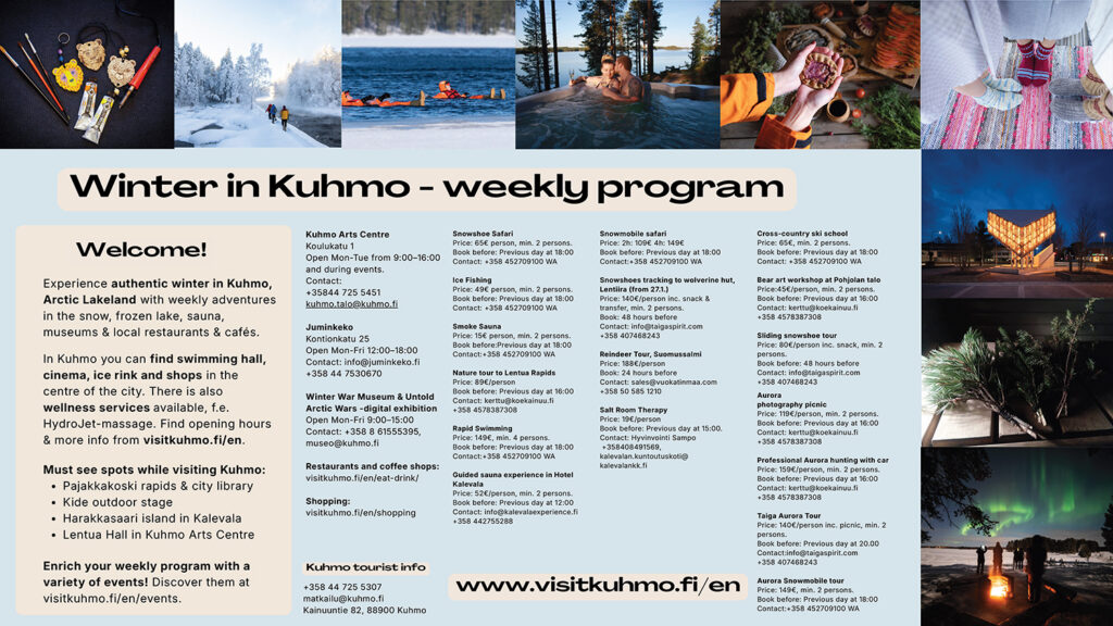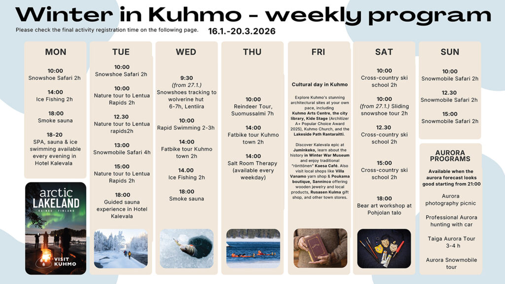 Kuhmo in Arctic Lakeland, Finland, offers activities all year round. This brand-new weekly program will help you plan your visit. How about trying exciting rapid swimming, a guided sauna experience, or a bear art workshop? These activities and many more are available for everyone! Read more: https://visitkuhmo.fi/en/winter-weekly-program2026/